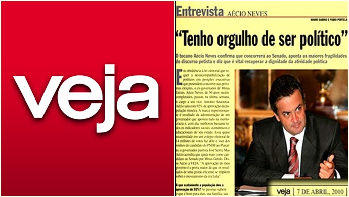 A edição da revista Veja que chegou às bancas em 3 de abril de 2010 dedicou três páginas em espaço de destaque de entrevistas da publicação, chamado de páginas amarelas, ao atual senador Aécio Neves (PSDB-MG). Foi uma entrevista em que todas as perguntas eram elogiosas ao tucano, e sob medida para atacar os principais adversários políticos. Observando o texto, nota-se que o objetivo era a promoção da candidatura de Aécio ao Senado naquele ano.