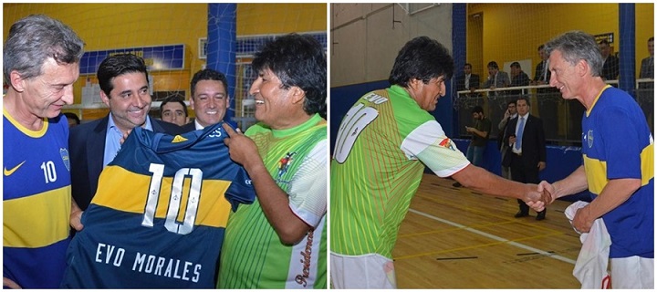 O presidente da Argentina, Mauricio Macri, jogou futebol com o seu homólogo boliviano, Evo Morales, nesta quinta-feira (10/12), a poucas horas de tomar posse à frente da Casa Rosada. A partida ocorreu em uma quadra do Boca Juniors, clube que Macri foi presidente entre 1995 e 2007. O placar do jogo não foi revelado.