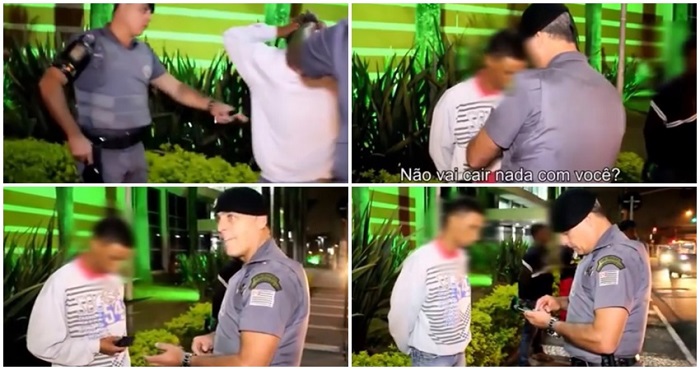 Em seguida ele pega o celular do abordado e começa a vasculhar o telefone, desprezando o direito constitucional à intimidade assegurado a todo cidadão brasileiro. Pergunta o modelo e o valor do aparelho. Ao descobrir que custa 700 reais, pergunta se o rapaz trabalha e qual o salário dele.