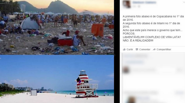 Vem circulando pelas redes sociais, desde o último dia 1º, uma montagem comparando a quantidade de lixo deixado em uma praia de Miami (EUA) e na praia de Copacabana (RJ) após a festa de Ano Novo. O intuito da postagem, que foi compartilhada por centenas de internautas, era o de depreciar o brasileiro diante do cidadão estadunidense, conforme sugeriu o próprio autor da montagem na legenda.
