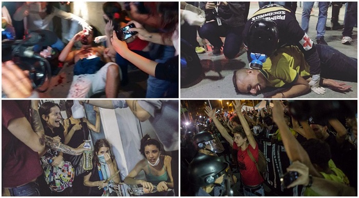 Mesmo caminhando de mãos erguidas, pacificamente e pedindo “sem violência”, o ato foi atacado intensamente, numa saraivada de spray de pimenta contra as pessoas na linha de frente, balas de borracha e bombas de gás lacrimogêneo lançadas contra os que vinham mais atrás.