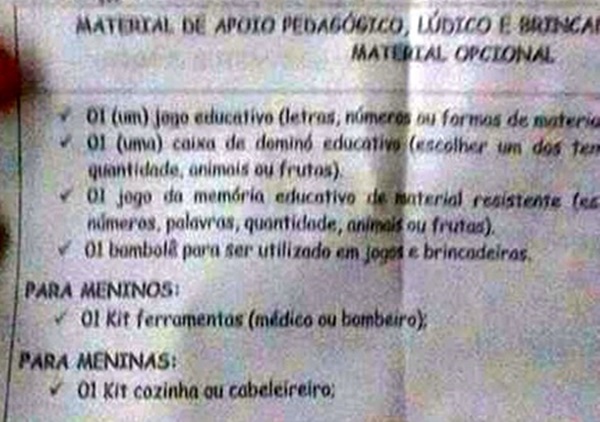 A história começou a ganhar proporção quando a página feminista Coletivo Fridas divulgou no Facebook uma nota de repúdio à escola com uma foto da lista considerada “sexista”. Na imagem, é possível ver kits de brinquedos divididos por gêneros.