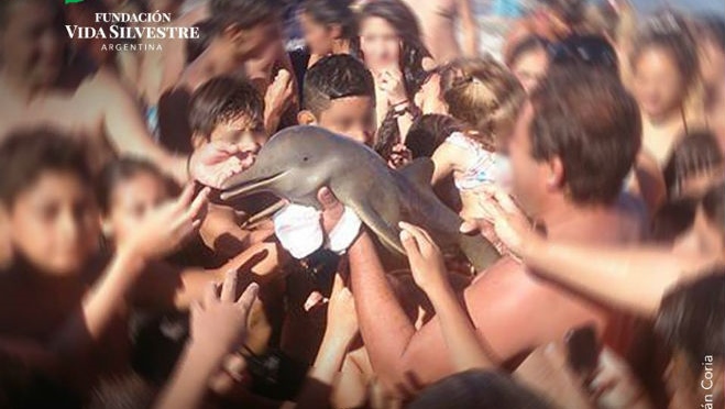 Segundo a fundação, há pelo menos dois registros de golfinhos do tipo franciscana — um dos menores do mundo, que mede entre 1,30 e 1,70 metro — sendo tirados da água por banhistas que posavam com os animais na praia. A entidade confirma que pelo menos um dos animais morreu poucos minutos depois e seu corpo foi deixado na areia.