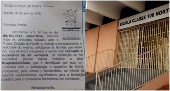 A diretora disse que chegou a receber uma ligação acusando-a de ser comunista e ameaçando-a. Na semana passada, a Escola Classe 106 Norte, localizada no Plano Piloto da cidade, pediu que os pais vestissem os alunos com “camisetas e/ou assessórios” vermelhos, para uma atividade na última sexta-feira (8), como parte do projeto Cidadão do Mundo. Segundo a vice-diretora, Lisete Prediger, o uso da cor vermelha significava um “alerta” para o combate à dengue.