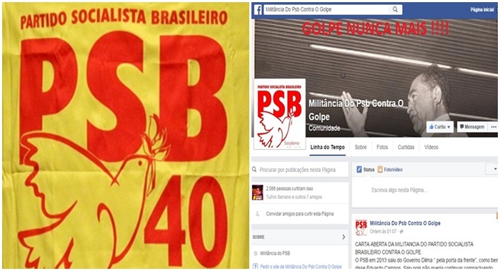Militância do PSB se revolta e divulga carta contundente contra o apoio oficial do partido ao golpe. "Saímos do governo junto com Eduardo Campos pela porta da frente, o que não significa que apoiamos esse golpe de estado perpetrado pelas forças mais conservadoras e esdrúxulas do Brasil. Nosso lado não é o de Cunha, Temer e Bolsonaro, viúvas da ditadura"