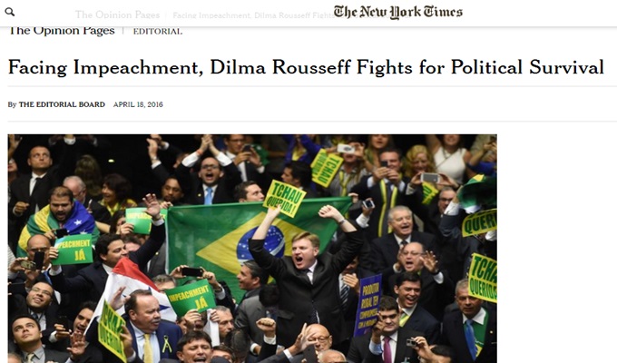 Editorial do The New York Times questiona impeachment no Brasil e afirma que processo é, na verdade, um “referendo sobre Partido dos Trabalhadores”. Jornal afirma que Dilma Rousseff está sendo responsabilizada por práticas que foram cometidas por outros políticos sem tanto “escrutínio”.