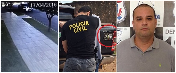 No destaque da foto da prisão de Thiago, há um adesivo com os dizeres “Fora Dilma”.
