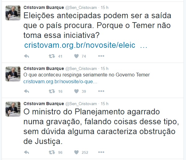 Paulo Coelho ficou irritado com Cristovam quando o senador, após a divulgação dos áudios de Jucá, começou a disparar mensagens contra o governo de Michel Temer, não assumindo sua responsabilidade por participar ativamente do processo que afastou Dilma e empossou o vice.