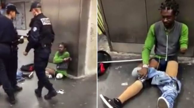 Polícia é polícia, em qualquer lugar do mundo? Uma cena brutal chocou e revoltou os franceses. Policiais “anti-terror” humilham um imigrante negro com três membros amputados