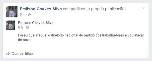 Um perfil no Facebook em nome de Emilson Chaves Silva traz uma postagem, na manhã de hoje, republicada diversas vezes que diz: “Foi eu quem ataquei o diretório nacional do partido dos trabalhadores e vou atacar de novo…”