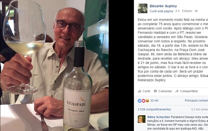 A postagem de Suplicy estava, até o momento da publicação desta nota, com mais de 1400 compartilhamentos, em que internautas garantem que comparecerão à comemoração.