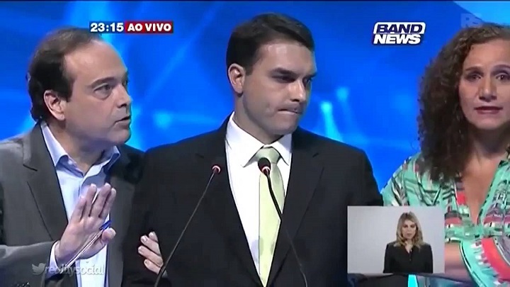 Na volta da transmissão do debate – que entrou em intervalo devido ao fato – a candidata disse que foi maltratada pelo pai de Flávio, o deputado federal Jair Bolsonaro (PSC-RJ), durante o break.