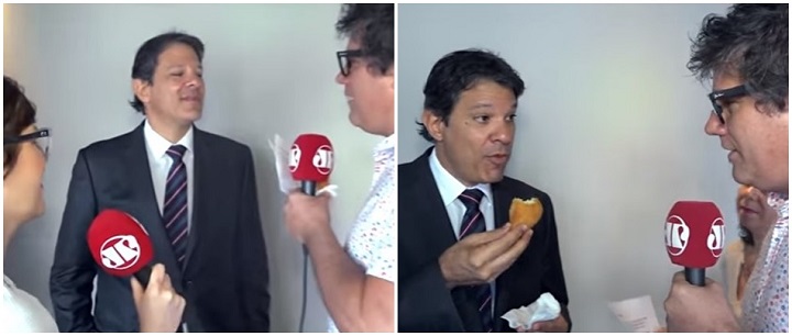 Haddad ainda foi estimulado a comer uma coxinha no início da abordagem e a ‘cantar um rap’ no final do encontro. Internautas repercutiram o quadro. “Que vergonha alheia, essa JP. Claro que essa patifaria não pode mais ser chamada de jornalismo”, publicou um usuário.