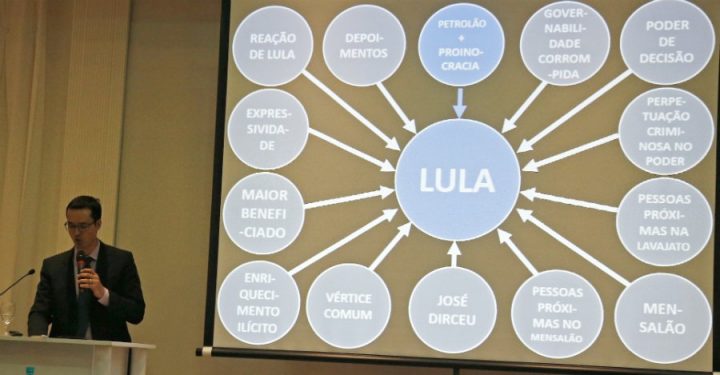 Em apresentação transmitida ao vivo pela TV, o procurador acusou Lula de estar no centro de uma organização criminosa destinada a “saquear os cofres públicos” e assegurar sua “perpetuação criminosa no poder”. Ele resumiu a tese com um diagrama em que todas as setas apontam para o ex-presidente.