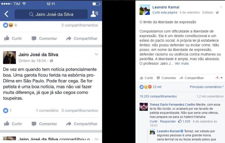 O professor Jairo José da Silva é titular da Unesp e com consagrada carreira acadêmica. Tudo indica tratar-se de pesquisador sério e reconhecido em muitos bons centros. Isto não impediu de afirmar algo muito difícil no seu facebook. Diante do fato de uma aluna Deborah Fabri, de 19 anos, ter sido atingida no olho por bala de borracha e ter perdido a visão, o docente comentou que era uma notícia potencialmente boa que ela ficasse cega.