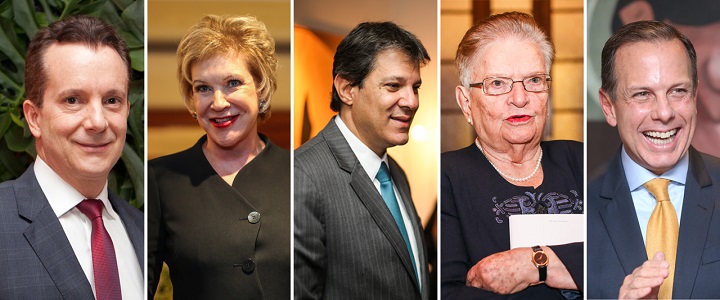 Em seguida vêm a senadora e ex-prefeita Marta Suplicy (PMDB), com 15%; o atual prefeito, Fernando Haddad (PT), com 12%, e a deputada federal e ex-prefeita Luiza Erundina (PSOL), com 4%. Major Olimpio (Solidariedade) teve 1% das intenções de voto, assim como João Bico (PSDC) e Levy Fidelix (PRTB). Altino Prazeres (PSTU), Henrique Áreas (PCO) e Ricardo Young (Rede) não pontuaram.