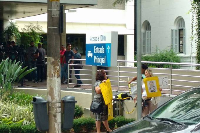 Três mulheres vestiram-se de amarelo na tarde desta quarta-feira (25) e, portando cartazes, foram até a porta do Hospital Sírio Libanês pedir a prisão do ex-presidente Lula e a transferência de Marisa Letícia para o SUS — a ex-primeira-dama está internada em coma induzido devido a um AVC hemorrágico.