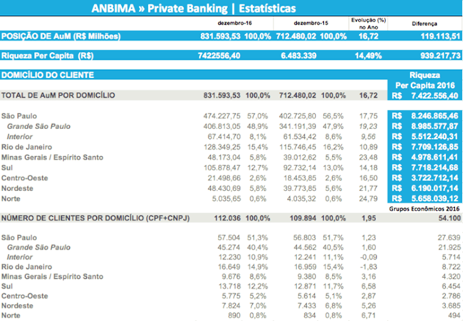 Segundo o mapeamento mais recente da ANBIMA, o Private Banking brasileiro reunia, ao fim de 2016, R$ 831,6 bilhões, de 112 mil clientes ou 54,1 mil famílias. Estas são as dos verdadeiros “Donos do Poder”. Com esta base de clientes crescendo menos de 2% (ou 2.142 CPFs), a riqueza financeira per capita se elevou em 14,49%. Não era de se esperar com o juro básico (Selic) permanecendo em 14,25% aa durante dez meses?!