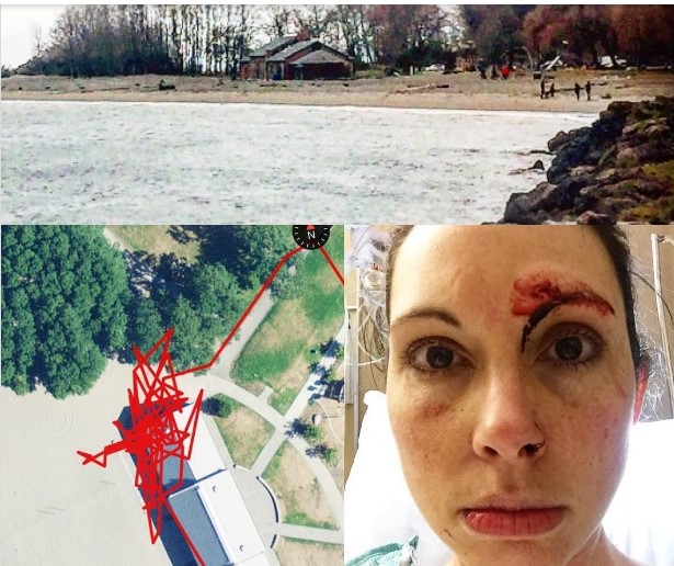 “Meu maior pesadelo tornou-se realidade – em uma corrida de 6,5 km na tarde de domingo, eu parei para usar o banheiro e fui atacada por um homem que se escondia em uma das cabines”, escreveu na montagem que mostrava o rosto ferido e o caminho que havia percorrido no parque (imagem acima).