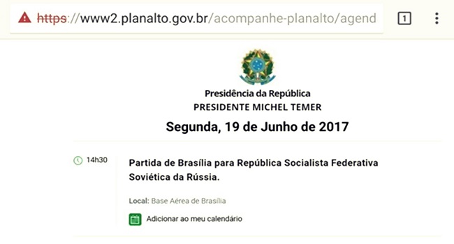 A assessoria de Michel Temer divulgou nesta segunda-feira (19/06), pelo site do Palácio do Planalto, que às 14h30 o presidente partiria de Brasília para a “República Socialista Federativa Soviética da Rússia”. Após alguns minutos, o erro foi corrigido e o destino foi alterado para Federação Russa, nome oficial do país.