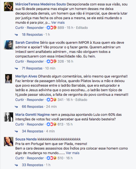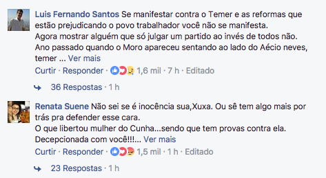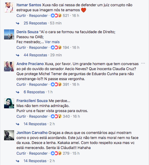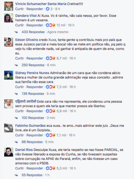 A publicação viralizou. Mas, para a surpresa da apresentadora, que imaginava que Sergio Moro seria uma figura imune a críticas e impassível de rejeição, os comentários mais curtidos da postagem não refletiram exatamente o pensamento de Xuxa.