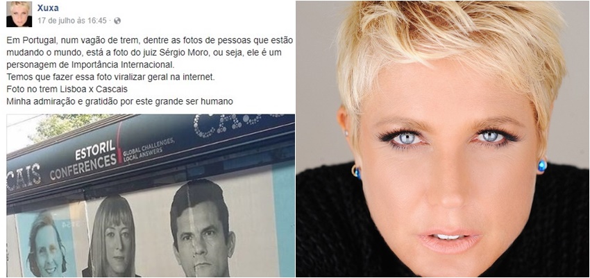 A apresentadora Xuxa Meneghel publicou na última segunda-feira (17) em sua página oficial no Facebook a foto de uma propaganda em um vagão de um trem em Portugal, na qual o juiz Sergio Moro aparece entre pessoas que estariam ‘mudando o mundo’.