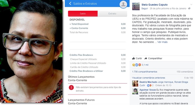 A professora Stela Guedes Caputo, de 50 anos, tomou um susto quando, na semana passada, checou sua conta bancária: estava vazia, zerada, sem nenhum tostão. Ela não tinha nem sequer um real para ajudar a pagar a passagem até a universidade pública onde dá aulas há cinco anos, a Uerj (Universidade do Estado do Rio de Janeiro).