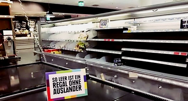Quando os clientes entraram no supermercado Edeka, em Hamburgo, ficaram surpresos ao se depararam com as prateleiras quase vazias, apenas com uma pequena quantidade de produtos que foram feitos na Alemanha estavam lá.