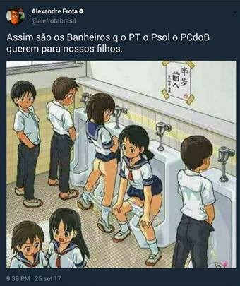 Em sua conta no Twitter, Frota publicou um desenho com meninas e meninos em um banheiro com a legenda: “Assim são os banheiros que o PT, o PSOL e PCdoB querem para os nossos filhos”.