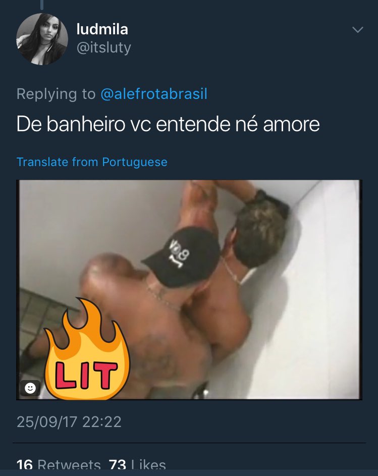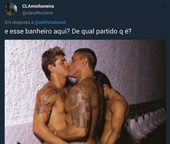 O perfil identificado como “CLAminhoneira” rebateu com uma foto de Alexandre Frota sem roupas beijando outros homens num banheiro público e a seguinte legenda: “E esse banheiro aqui, de qual partido que é?”.