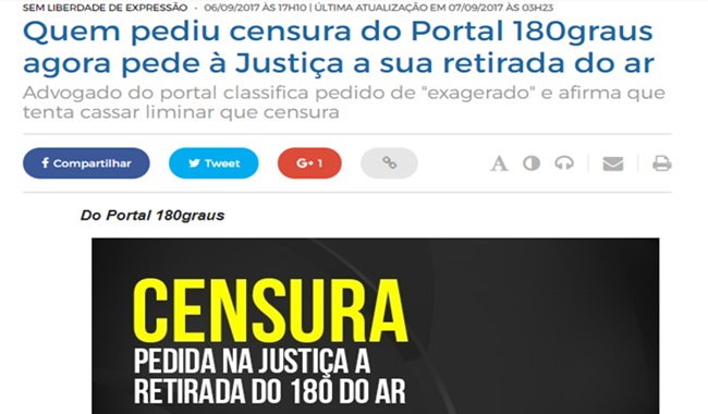 O Portal 180graus, site jornalístico do Piauí, no nordeste do Brasil, está sob censura desde o fim de agosto, quando a Justiça atendeu ao pedido de um empresário investigado em suposto esquema de corrupção noticiado pela publicação. Agora, o site informa que o empresário apresentou nova petição judicial solicitando que o Portal 180graus seja retirado do ar.
