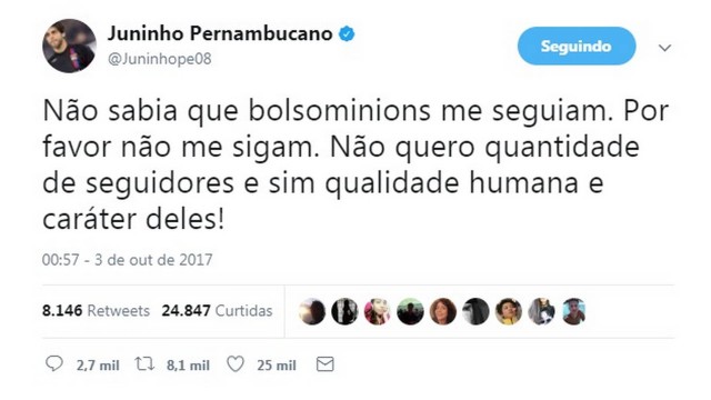 Ao perceber que estava sendo alvo de comentários agressivos, Juninho Pernambucano pediu para que 'Bolsominions' desapareçam do seu Twitter. Filho de Bolsonaro intrometeu-se no episódio e tomou 'chega pra lá' do jogador. "Não quero quantidade de seguidores e sim qualidade humana e caráter deles"