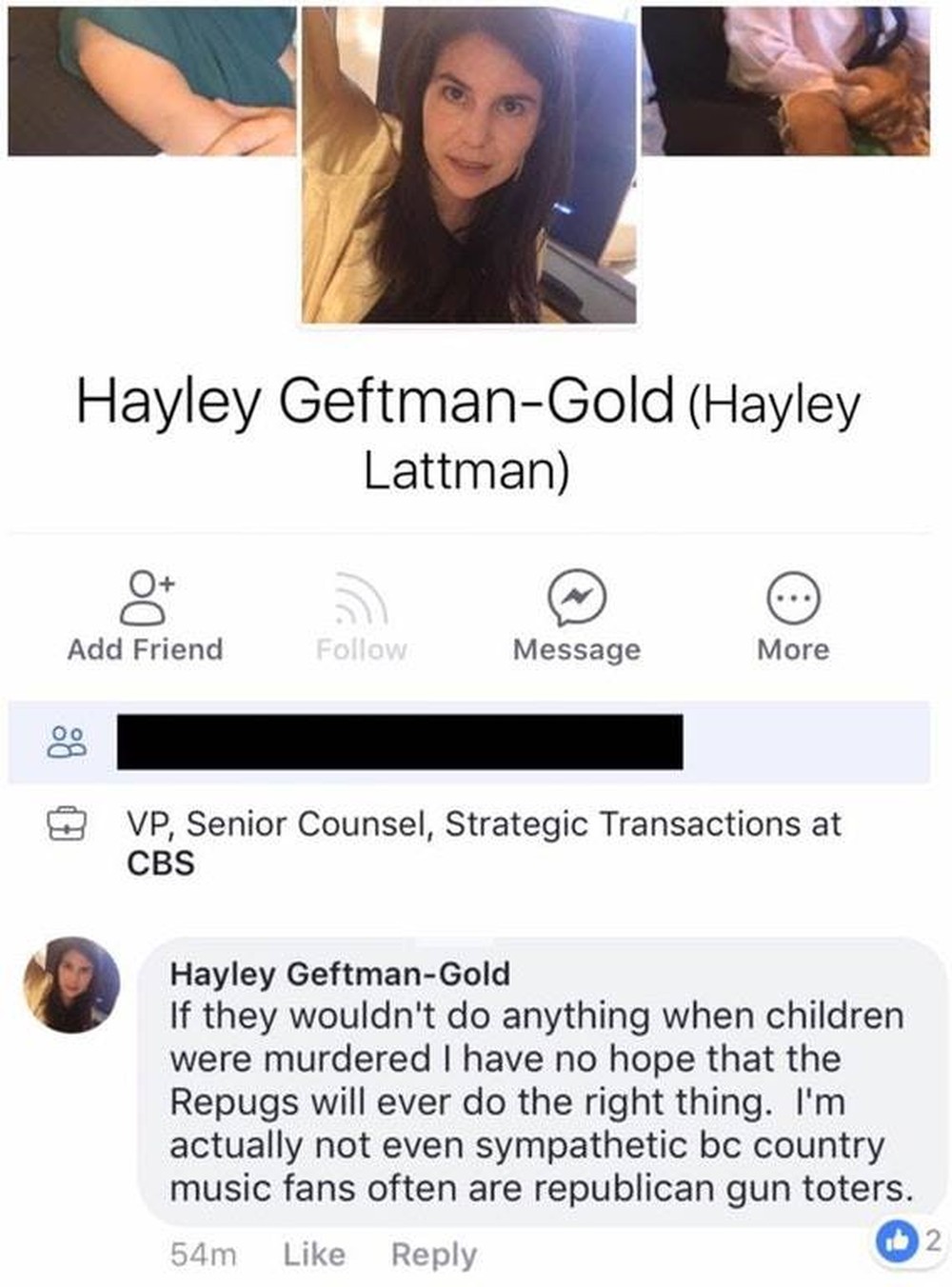 “Se eles não fizeram nada quando crianças foram assassinadas, eu não tenho esperança de que os ‘Repugs’ irão algum dia fazer a coisa certa. Eu realmente não sou muito solidária porque os fãs de música country normalmente são republicanos defensores de armas”, escreveu a executiva no Facebook.