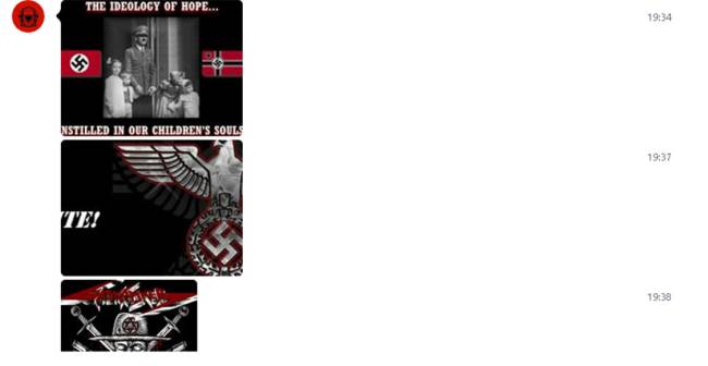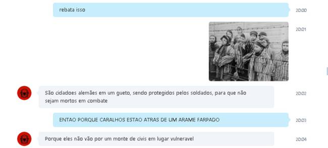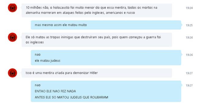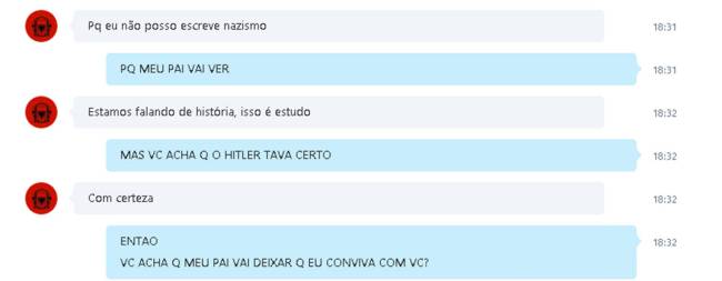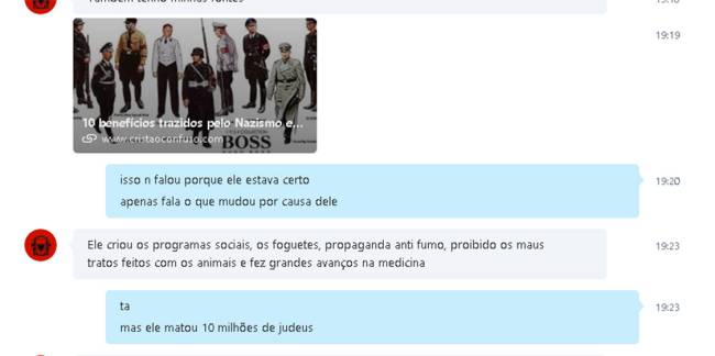 Na conversa, o amigo tenta demovê-lo desses pensamentos, mas ele os justifica citando blogs, vídeos e fotos que fazem apologia ao nazismo.