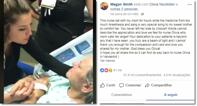 “Sua dedicação ao pacientes está além de tudo que eu vi, você é realmente um feixe de luz e não posso agradecer o suficiente pela compaixão, cuidado e amor que teve com minha mãe. Deus te abençoe Olivia!”, finalizou. Infelizmente a mulher acabou falecendo na quarta-feira (25).