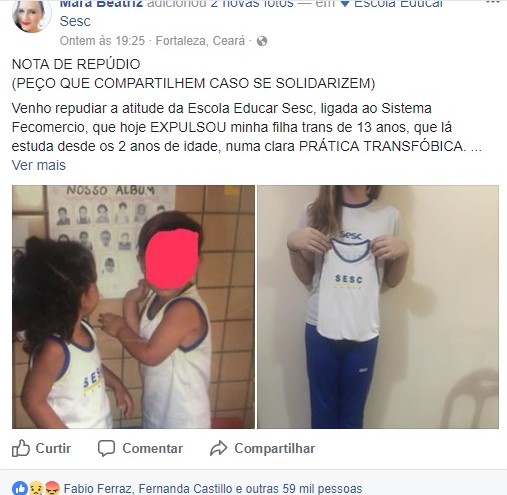 O texto a seguir foi publicado por Mara Beatriz, em seu Facebook, depois que sua filha trans foi expulsa sem justificativa plausível pela Escola Educar Sesc. Postagem já conta com 59 mil curtidas na rede social.