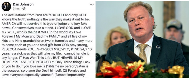 “O transtorno por estresse pós-traumático 24/7 (24 horas ao dia, 7 dias por semana) durante 16 anos é uma doença que me matará, já não posso controlar mais”, disse Johnson, pedindo a Deus que cuidasse de sua esposa, Rebecca.