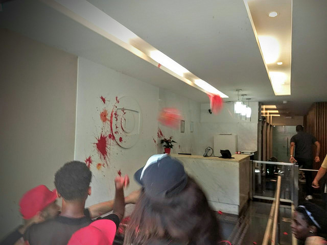 Manifestantes romperam o bloqueio de seguranças e policiais e entraram no hall de entrada do prédio da Rede Globo na tarde desta quarta-feira (24), e mancharam de vermelho o letreiro externo e o símbolo da emissora.