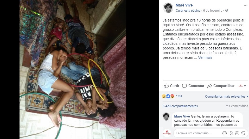 Enquanto isso, no Facebook, a página Maré Vive retratava a verdadeira dimensão do que ocorria na comunidade, através da publicação de uma imagem tocante e de um desabafo genuíno. Reproduzimos abaixo: