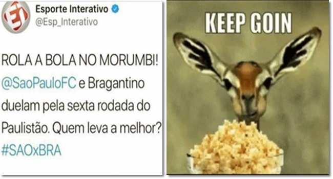 O São Paulo enfrentou o Bragantino, no estádio do Morumbi, na última quarta-feira, pelo Campeonato Paulista. A emissora ‘Esporte Interativo‘ usou uma imagem de um veado, em suas redes sociais, para para fazer a chamada do jogo. Torcedores e o próprio clube paulista ficaram revoltados com a atitude.