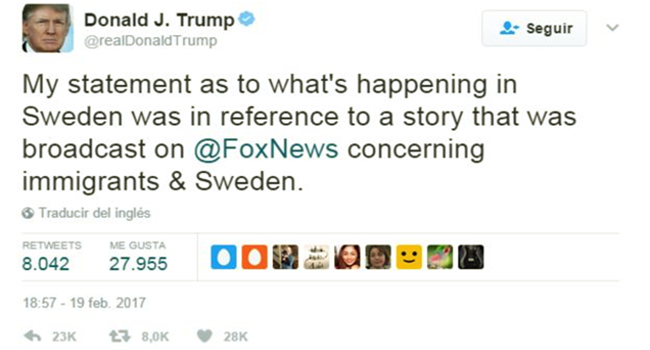 Trump esclareceu que estava se referindo a uma reportagem do canal Fox News sobre a situação dos refugiados na Suécia e o aumento da violência supostamente vinculada ao maior número de imigrantes.