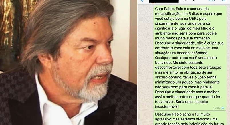 “A mensagem de whatsApp não foi escrita por mim. Uma pessoa da minha família pegou o meu celular. Todos ficaram revoltados porque um rapaz que morava com esse estudante passou na prova de residência daqui e de São Paulo. Mas decidiu segurar a vaga para o amigo estudar. E o meu filho estava logo depois dele”, disse o médico.