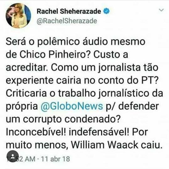 Entenda. Rachel Sheherazade referia-se a um áudio atribuído ao jornalista Chico Pinheiro, da TV Globo, que passou a circular em grupos de WhatsApp e vídeos do Youtube após o ex-presidente Lula se apresentar à Polícia Federal para cumprir pena.