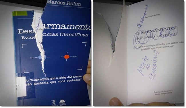 Em mais um exemplo de intolerância e depredação do patrimônio público nas universidades brasileiras, Bolsominion rasga livro sobre desarmamento na UFRN e deixa seu recado: #Bolsonaro2018 [...] “Morte ao Comunismo”