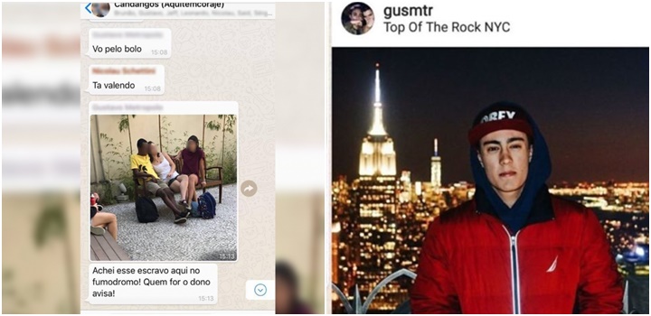 Uma mensagem de Gustavo publicada em um grupo privado de WhatsApp vazou nas redes sociais. Nela, o aluno encaminha uma foto de outro estudante negro com o seguinte comentário: “Achei um escravo no fumódromo! Quem for o dono avisa!”.