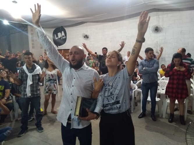 Imagem de Juliana e George no culto evangélico um dia depois da morte dos meninos: