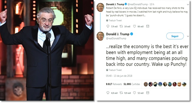 Irônico, Trump disse que, ao ser acertado na cabeça de verdade durante esses trabalhos, De Niro terminou com a capacidade mental afetada. “Robert De Niro, um indivíduo com QI muito baixo, levou muitos golpes de boxeadores reais na cabeça. Eu o assisti ontem à noite e realmente acredito que ele pode estar “desnorteado”. Acho que ele não se dá conta de que a economia está melhor do que nunca, com a empregabilidade em alta constante e muitas empresas investindo de novo em nosso país. Acorde!“, xingou Trump.