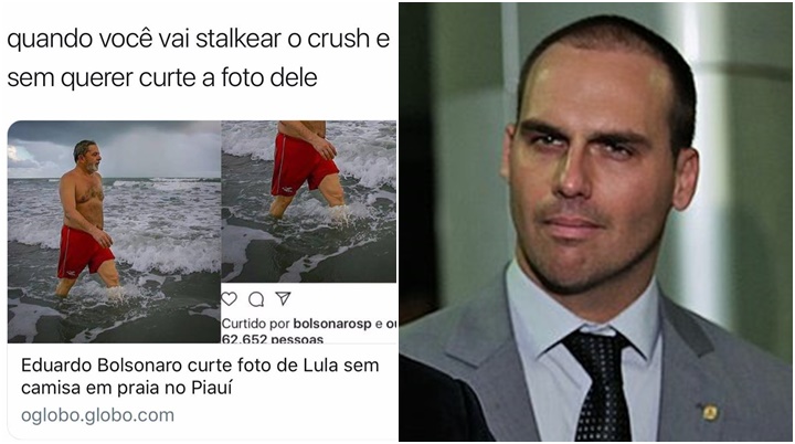 Eduardo Bolsonaro foi 'stalkear' o perfil de Lula no Instagram e acabou curtindo, provavelmente sem querer, uma foto do ex-presidente sem camisa na praia. Internautas não perdoaram a "mancada"