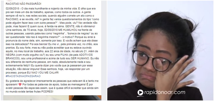 Além de NEGRA (com muito orgulho, viu?), sou uma filha (de pais ADOTIVOS BRANCOS), sou uma profissional e, acima de tudo, sou ser humano. Eu não sou diferente de nenhuma pessoa em absolutamente nada, e sou extremamente feliz. Quero dizer para vocês que já passaram por essa situação, que não deixem impune. Essa senhora, hoje, vai responder a um processo. Porque eu não vou me calar.