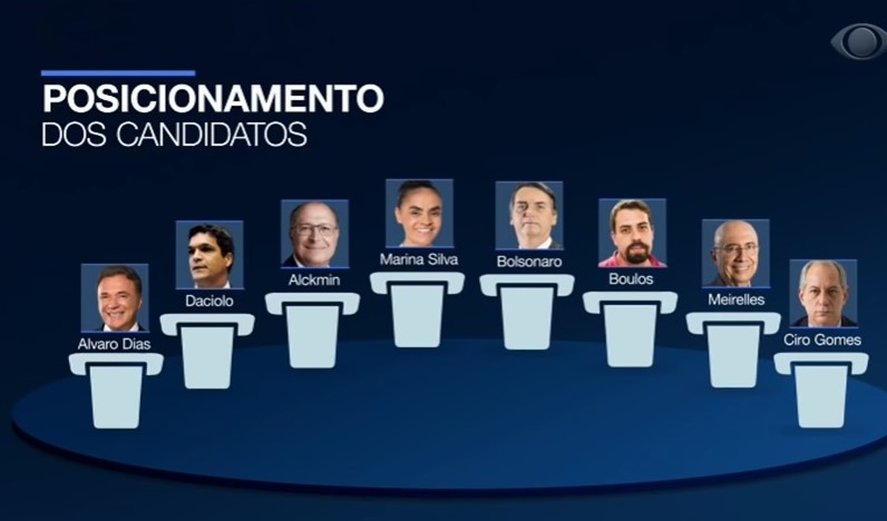 O debate será mediado pelo jornalista Ricardo Boechat e o posicionamento dos oito candidatos no cenário foi definido por sorteio (imagem acima). A transmissão do debate começa às 22h.